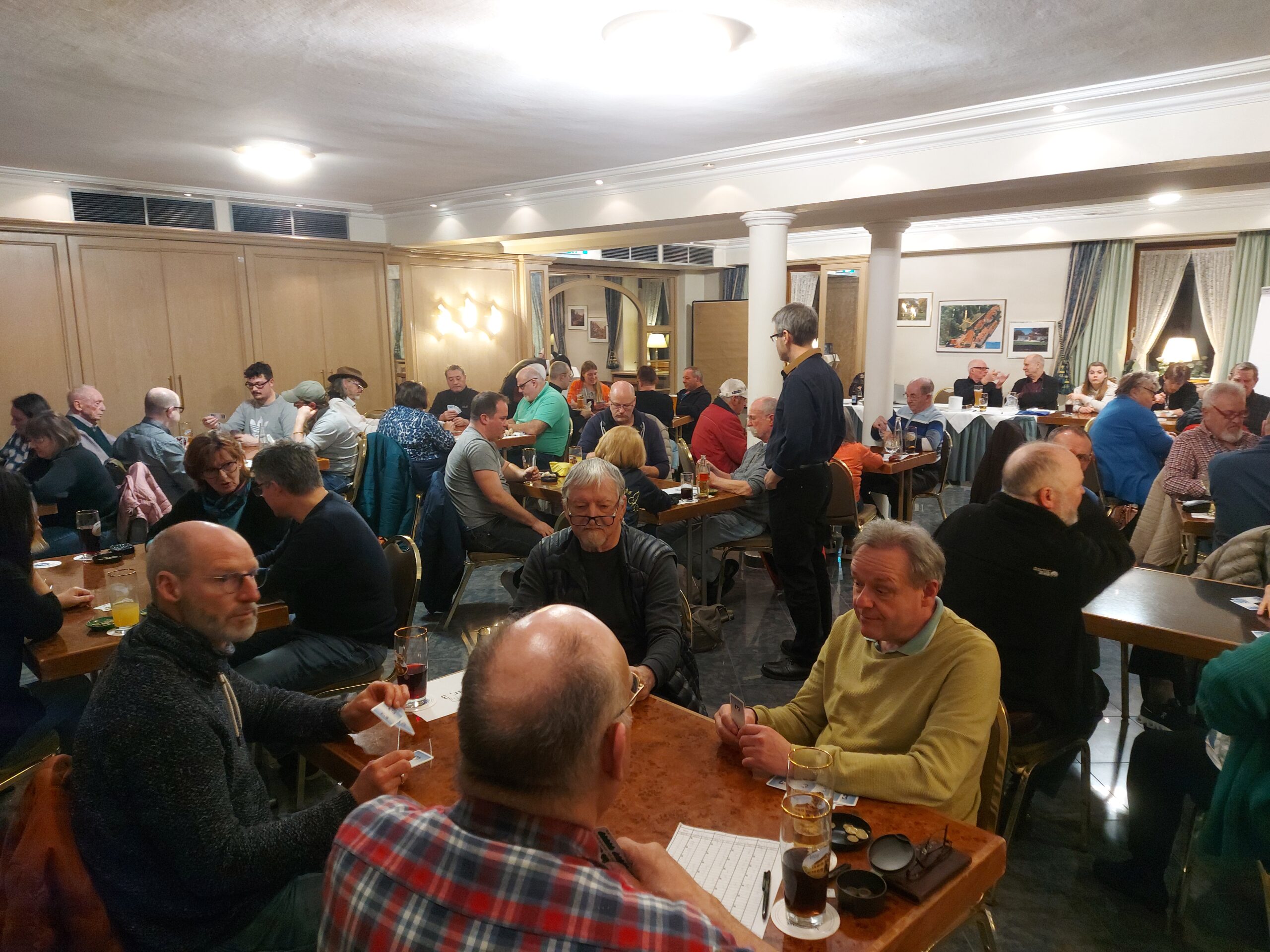 Am Freitag den 28.02.2025 fand das Frühjahrsschafkopfturnier des Krieger- und Soldatenverein Ismaning in unserer Vereinsgaststätte Gasthaus Neuwirt Festsaal 1.Stock statt. Diesmal wurde der Termin einen Monat früher als bisher üblich gewählt. Der 1. Vorstand konnte um 19:00 Uhr mehr als 44 Spieler im Festsaal unserer Vereinsgaststätte Gasthaus Neuwirt begrüßen. Nach der Begrüßung konnte das Spiel an 11 Tischen beginnen. Leider konnten 2 Mitspieler nicht am Turnier teilnehmen da sich kein ganzer Tisch mit 4 Mitspieler mehr bilden konnte. Durch Losverfahren wurden jeweils 4 Spieler pro Tisch zusammengebracht und die erste Runde konnte starten. Nach 32 Spielen pro Tisch wurde das Ergebnis der ersten Runde ausgewertet. Jetzt folgte die zweite Runde. Wieder wurden die Spieler mittels Losverfahren neu ausgewählt und es ergaben sich an jedem Tisch völlig neue Spielerzusammensetzungen. Nach wiederum 32 Spielen pro Tisch erfolgte die Auswertung dieser 2. Spielrunde.