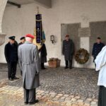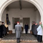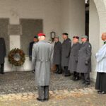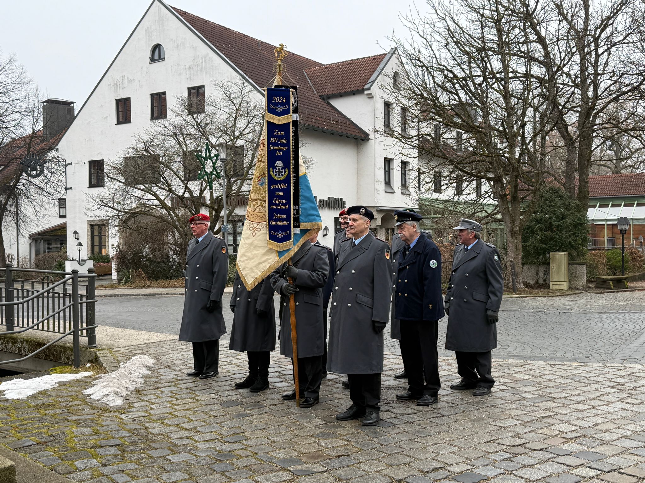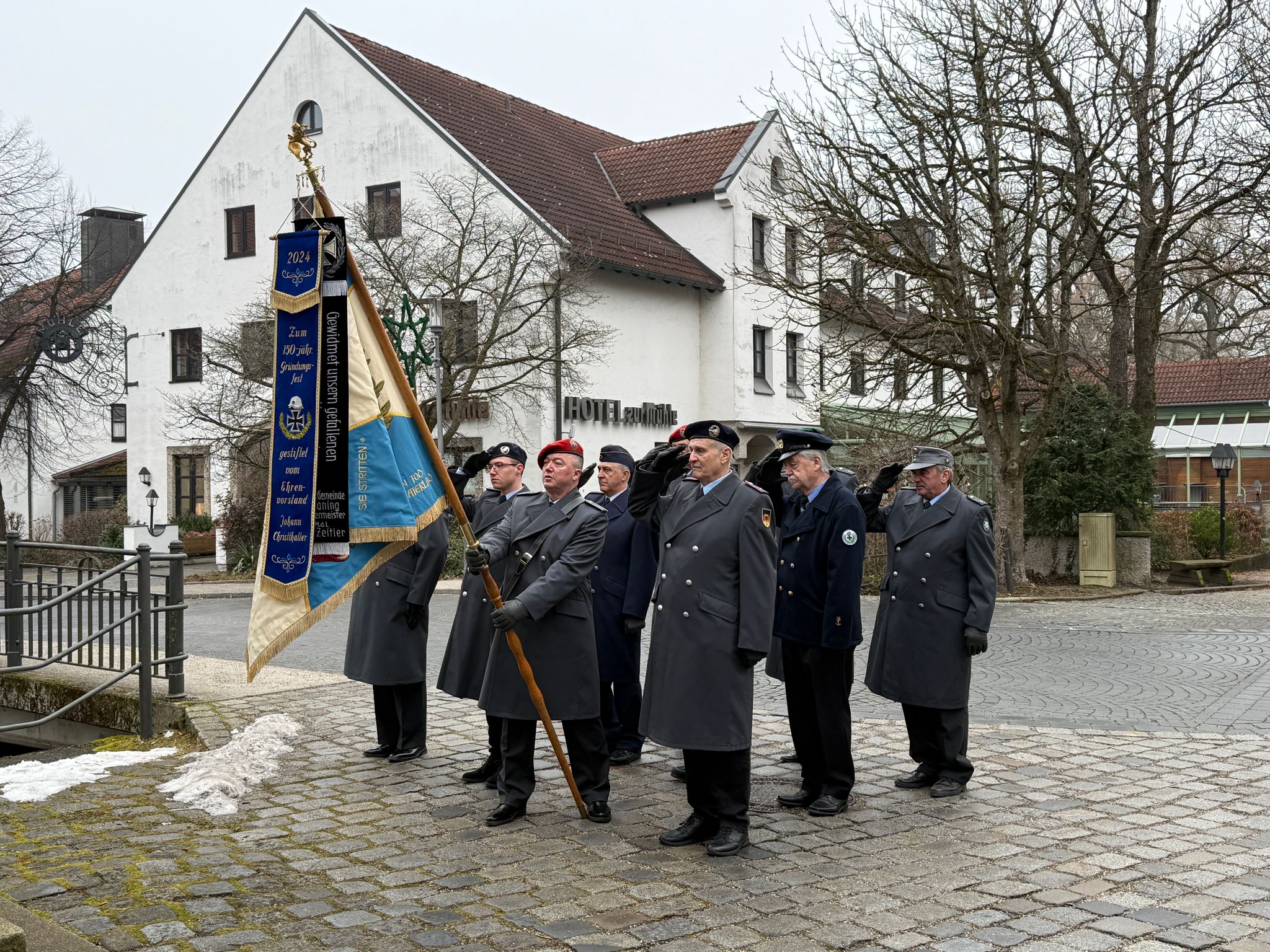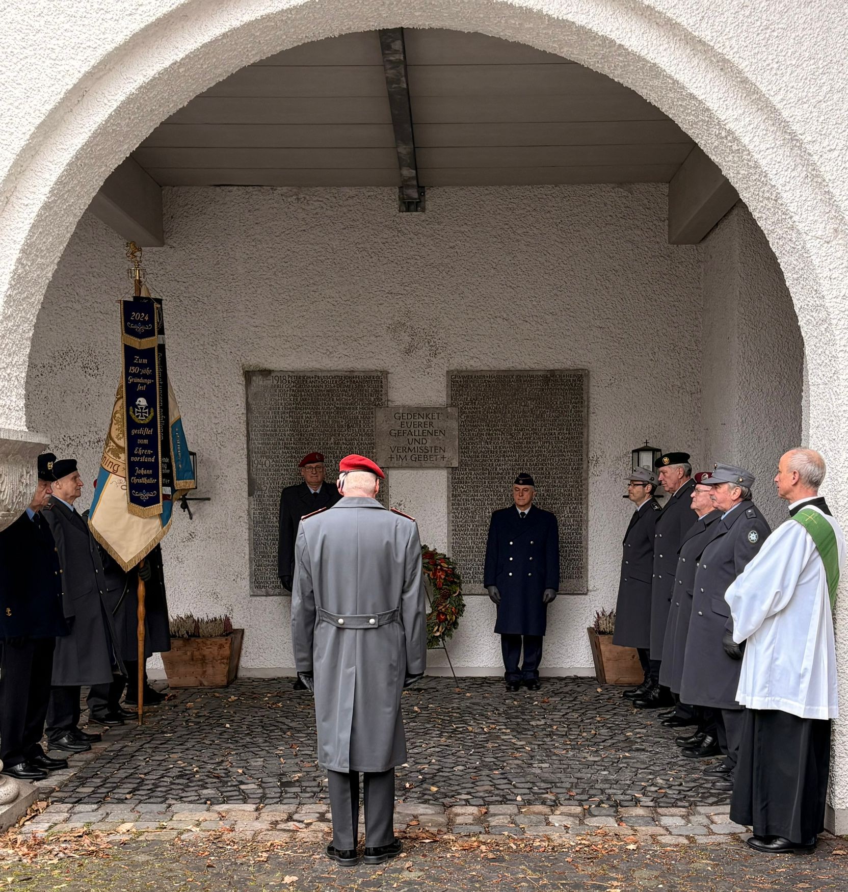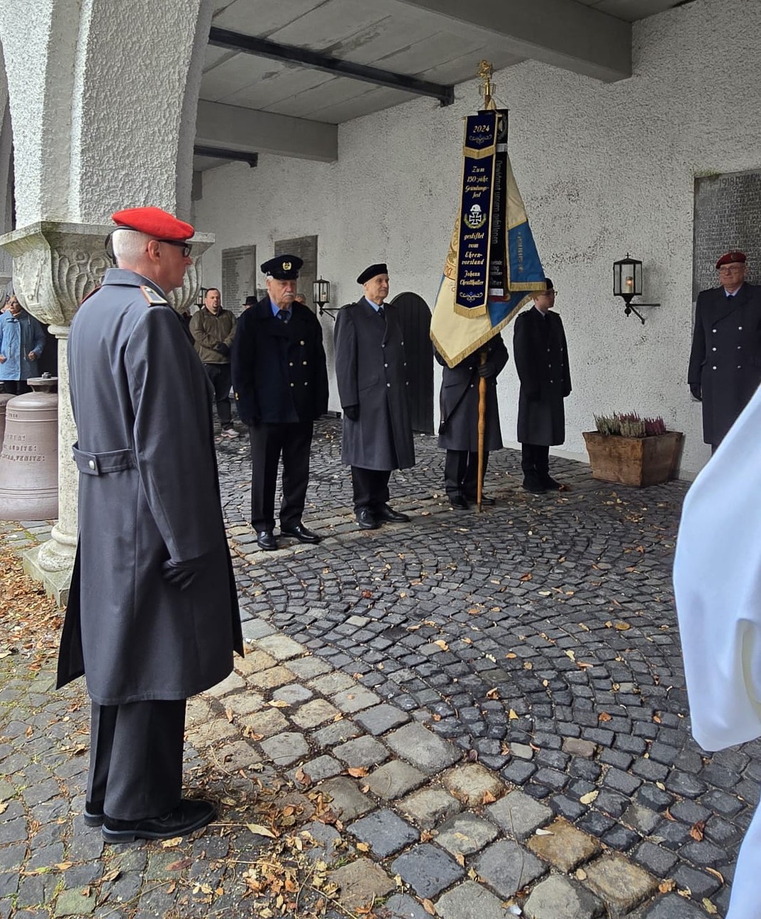 Danach fand das Zeremoniell mit einer repräsentativen Gestellung, dem Zapfenstreich und dem „Kameraden“ im Kircheninnenhof und dem Fahnengruß am „alten“ Kriegerdenkmal vor der Kirche statt. Beim Rückmarsch in unser Vereinsheim wurde zugleich den Gefallenen und Vermißten beider Weltkriege am Kriegerdenkmal in der Schloßstraße mit einem Fahnengruß gedacht.